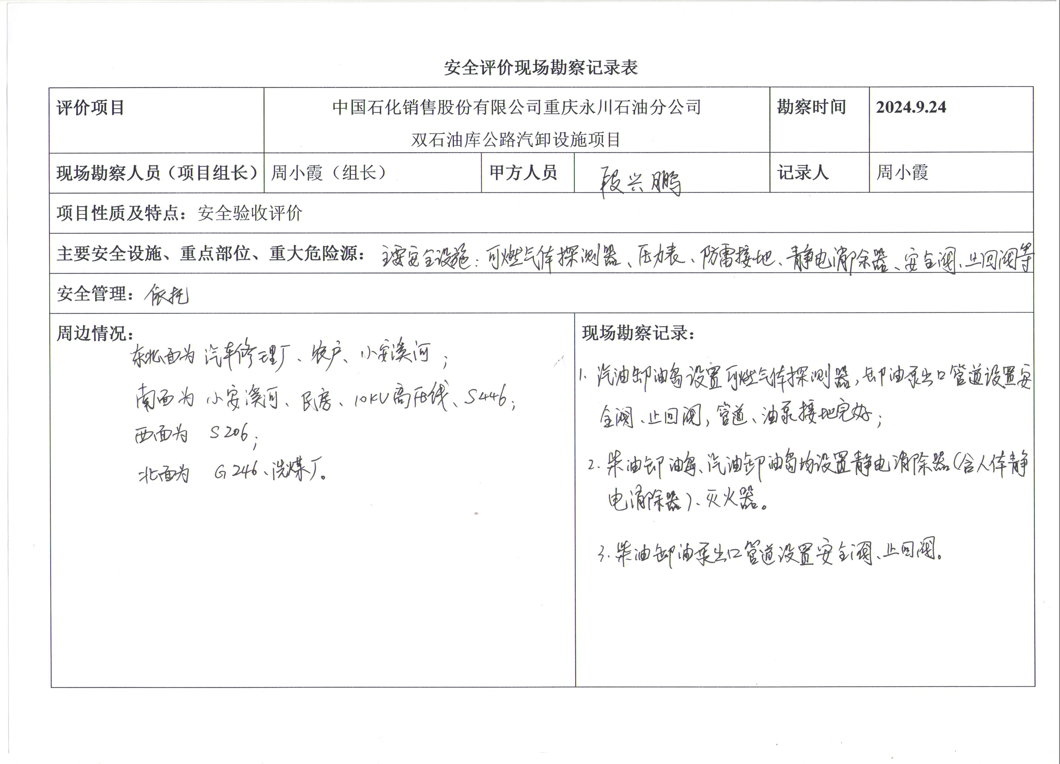 項(xiàng)目名稱 | 中國石化銷售股份有限公司重慶永川石油分公司雙石油庫公路汽卸設(shè)施項(xiàng)目安全驗(yàn)收評(píng)價(jià) | 合同編號(hào) | DA(渝)PJ033 | |||||