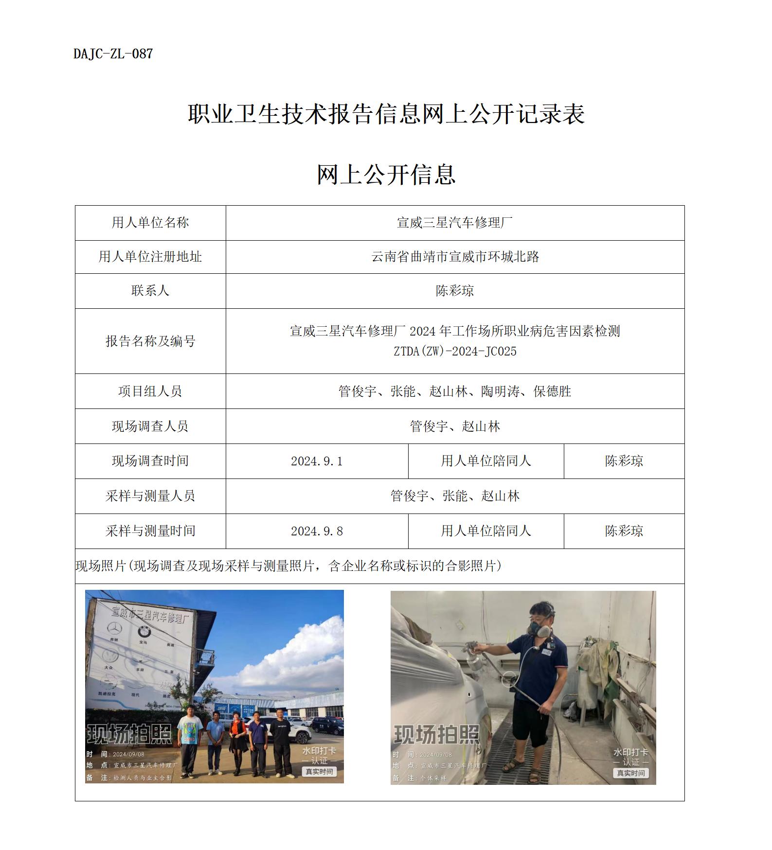宣威三星汽車修理廠2024年工作場所職業病危害因素檢測 ZTDA(ZW)-2024-JC025