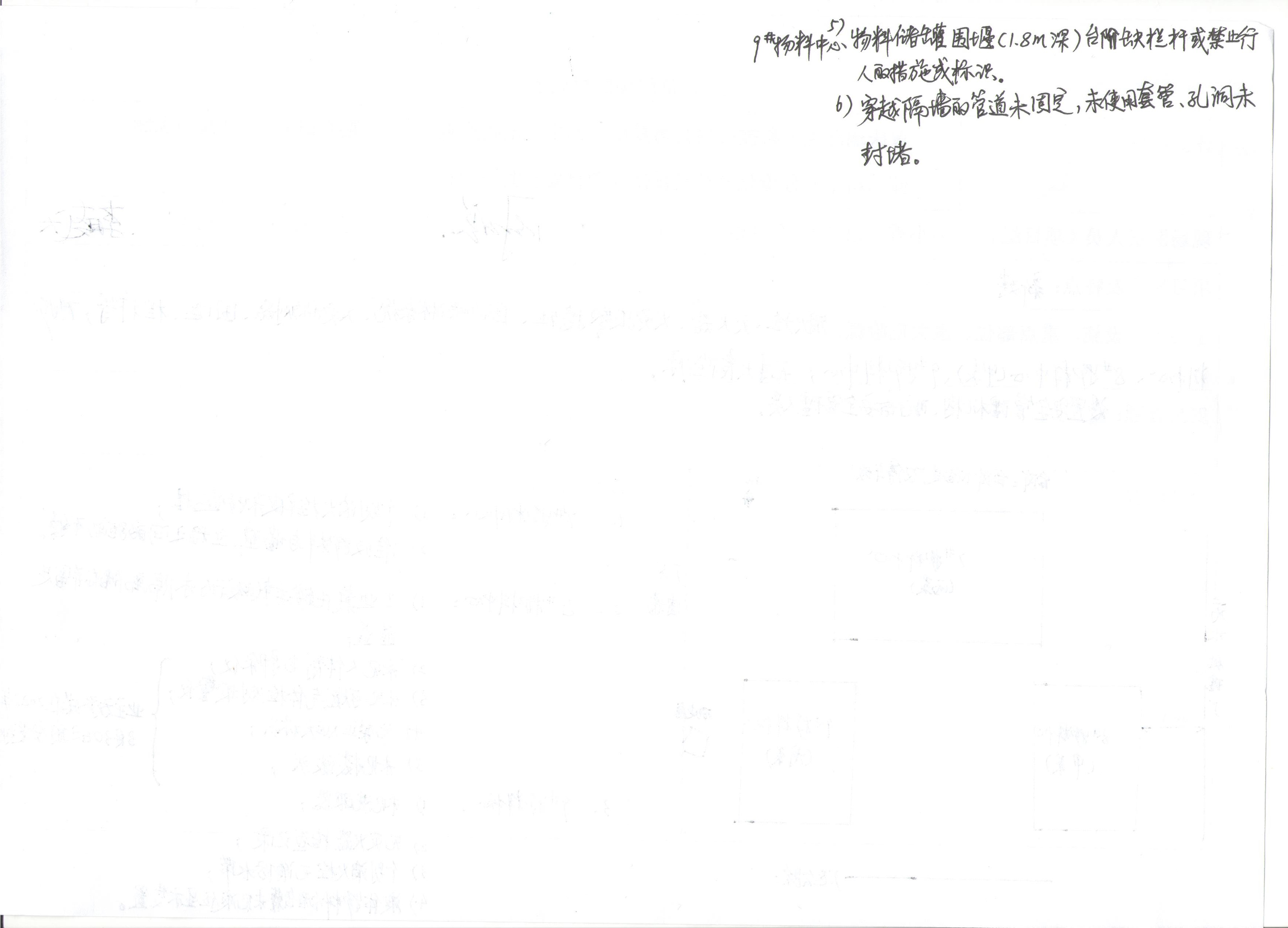 隱患: (1)7#物料中心(丙類)個別消火栓被雜物遮擋。 (2)7#物料中心(丙類)堆放物料與墻壁、立柱之間的距離不夠。 (3)無禁止煙火標識。 (4)無滅火器檢查記錄。 (5)個別消火栓無水帶。 (6)9#物料中心(戊類)液體物料儲罐無液位顯示裝置。 (7)9#物料中心(戊類)進入圍堰的臺階邊緣無欄桿,圍堰缺乏禁止通行措施或警示標識。 (8)9#物料中心(戊類)穿越隔墻的管道未固定,未使用套管,孔洞未封堵。 | ||||||||